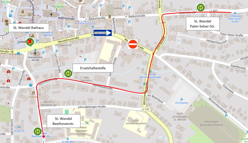 Fahrten der Linie 621 müssen daher umgeleitet werden. Regulär bis zur Haltestelle St. Wendel Pater-Selzer-Str., anschließend über Zum Rondell – Werschweilerstraße – Gymnasialstraße – Beethovenstraße an die Haltestelle St. Wendel Beethovenstraße fahren. Die Haltestelle St. Wendel Rathaus entfällt – eine Ersatzhaltestelle ist in der Gymnasialstraße aufgestellt. Die Gegenrichtung verkehrt ohne Einschränkungen.