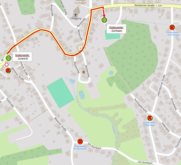 Aufgrund einer Baumaßnahme ist ab Freitag, 5. September 2025, das Abbiegen von der Dorfstraße in die Bliesener Straße nicht möglich. Die Linie 627 bedient daher die Haltestelle Güdesweiler/Scheid B und verkehrt anschließend ohne weiteren Halt bis zur Haltestelle Güdesweiler Dorfplatz. Verfrühte Abfahrten sind unbedingt zu vermeiden; die Gegenrichtung verkehrt entsprechend. Die Haltestellen Güdesweiler Scheid C, Am Gombach, Falkenweg und Lerchenweg entfallen ersatzlos.