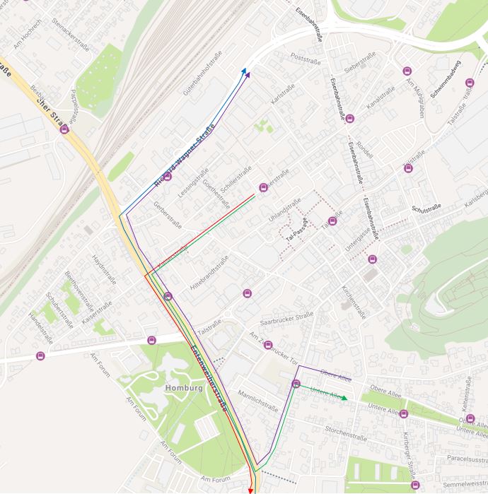 Die Fahrten der Linie 505 in Richtung Bexbach fahren planmäßig bis zur Haltestelle Homburg Amtsgericht, dann links auf die Zweibrücker Straße abbiegen und dieser bis zur Kreuzung Bexbacher Straße folgen. Hier rechts abbiegen dann weiter entlang der Bexbacher Straße bis zur Richard-Wagner-Straße und über diese zum Bahnhof in Homburg. (Lila Linie) Ab hier weiter gem. regulärem Linienweg.