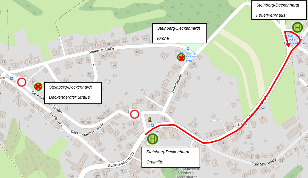 Bitte nach der Haltestelle Steinberg-Deckenhardt/Ortsmitte direkt zu der Haltestelle Steinberg-Deckenhardt/Feuerwehrhaus fahren. Verfrühungen sind absolut zu vermeiden, Gegenrichtung verkehrt entsprechend.