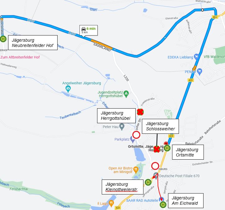 Fahrten in Richtung Homburg verkehren planmäßig bis zur Haltestelle „Jägersburg, Neubreitenfelder Hof“. Anschließend weiter geradeaus bis zum Kreuzungsbereich Dorfstraße/L 117 und dann rechts auf die L 117 abbiegen. Im Anschluss dem Straßenverlauf der L 117, über die Höcherstraße hinaus, bis zum Einmündungsbereich Höcherstraße/Rathausstraße in Waldmohr folgen und danach, ohne Halt, rechts in die Rathausstraße abbiegen. Anschließend rechts in die Saar-Pfalz-Straße (B 423) abbiegen und deren Verlauf bis zur Haltestelle „Jägersburg, Ortsmitte“ folgen. Danach weiter gem. regulärem Linienweg. In der Gegenrichtung entsprechend.