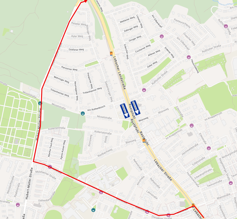 Planmäßig bis zur Haltestelle Saarbrücken Pariser Platz/St. Paulus, dann an der Kreuzung im Bereich der Haltestelle links auf die Rheinstraße abbiegen. Dieser folgen bis zur Kreuzung Hubert-Müller-Straße und dort rechts auf diese Straße abbiegen. Dem Verlauf der Hubert-Müller-Straße bis zum Ende bzw. der Auffahrt auf die A1 folgen. Ab hier weiter gemäß dem regulären Linienweg. Die Gegenrichtung ist nicht betroffen.