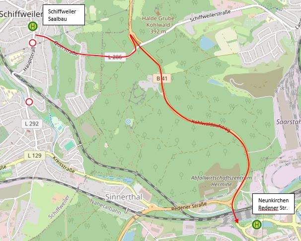 Die Haltestellen Schiffweiler Landsweilerstraße, Schiffweiler Bahnhof, Landsweiler-Reden Kino, Landsweiler Kath. Kirche, Landsweiler-Reden Stuppi, Landsweiler-Reden Buchenkopf, Neunkirchen Sinnerthal & Neunkirchen Hasselbach entfallen.