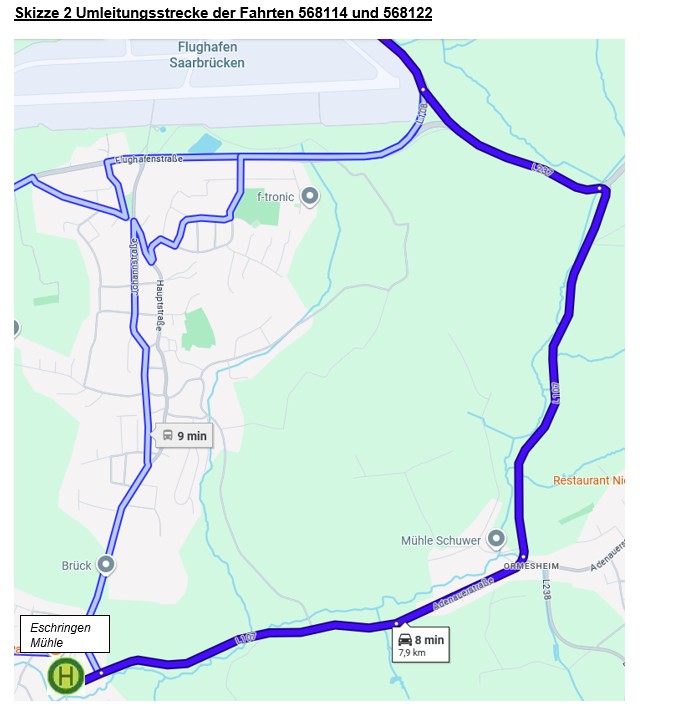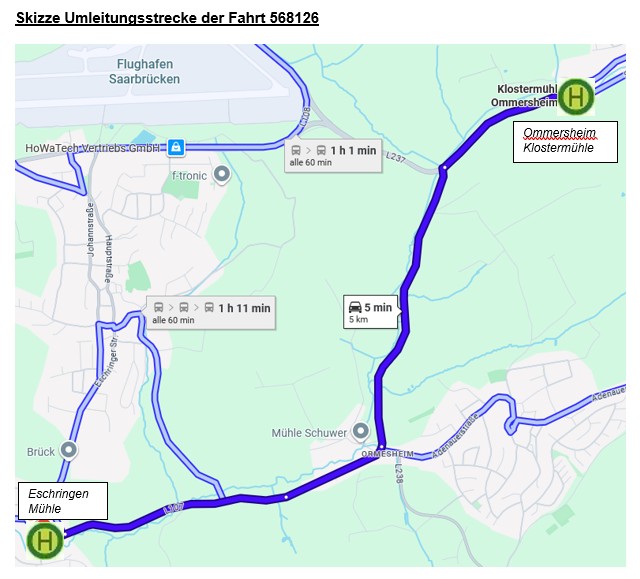 Die Haltepunkte Ensheim Kreuzfeldstr., Ensheim Marktweg, Ensheim Brückstr., Eschringen Am Rebenberg und Ormesheim Hüglingen müssen im o. g. Zeitraum leider entfallen.