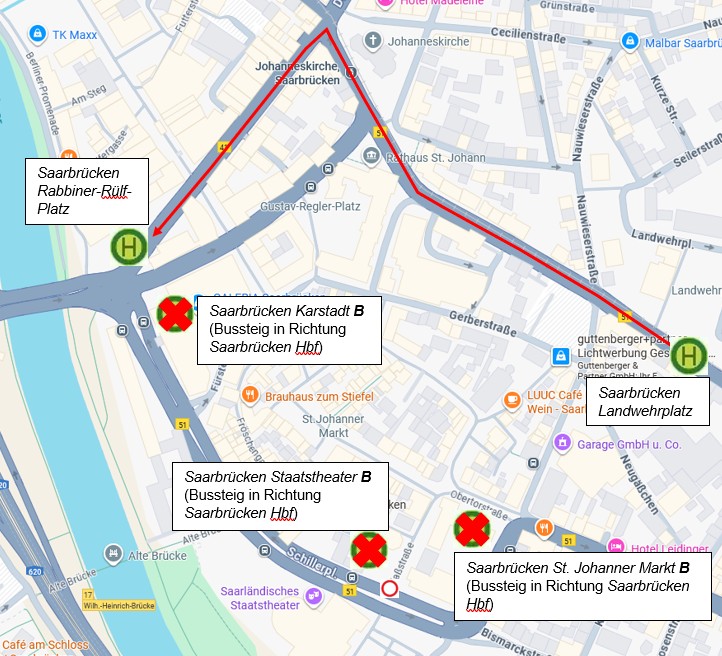 Die Haltepunkte Saarbrücken St. Johanner Markt, Saarbrücken Staatstheater und Saarbrücken Karstadt können in Richtung Saarbrücken Hbf leider nicht bedient werden.