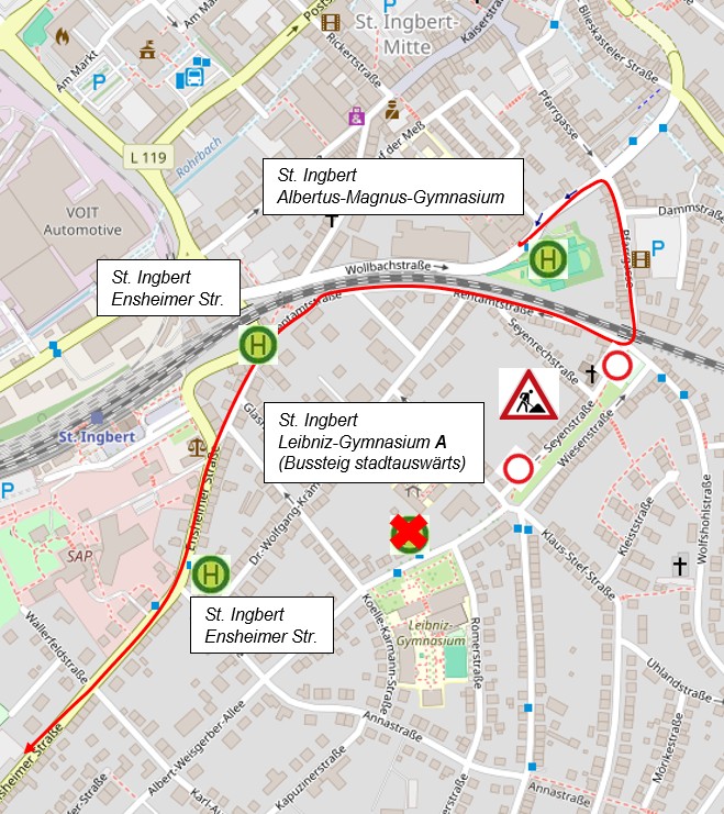 Die Haltestelle St. Ingbert Leibniz-Gymnasium entfällt in diesem Zeitraum. Die Gegenrichtung verkehrt ohne Einschränkungen!