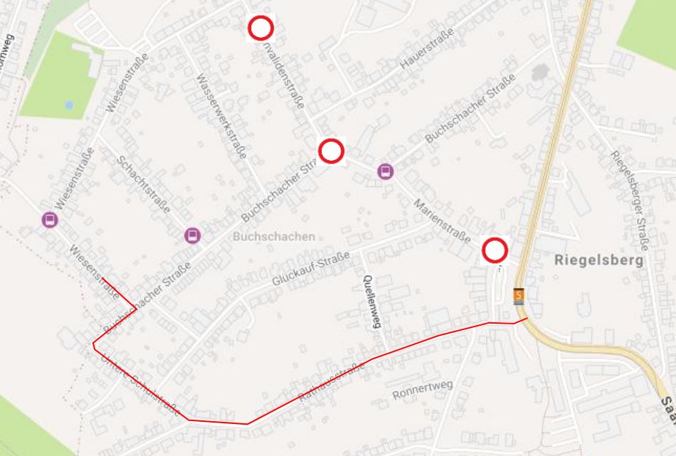 Die Fahrten der Linie 142, welche von der Wolfskaulstraße über Rathaus in die Marienstraße fahren, können planmäßig bis zur Haltestelle Riegelsberg Rathaus fahren. Direkt danach links ab in die Rathausstraße, welche im Verlauf zur unteren Schulstraße wird. Dieser bis zur Einmündung Wiesenstraße folgen und dort links abbiegen. Ab hier weiter gemäß regulärem Linienweg. In der Gegenrichtung entsprechend! Die Haltestellen Riegelsberg Marienstraße und Riegelsberg Buchschacher Straße entfallen im o.g. Zeitraum.