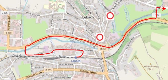 Während der Dauer der Sperrung wird vom Bahnhof aus in Lebach links auf die Poststraße abgebogen. Im Kreisel die erste Ausfahrt auf die B268 in Richtung St. Wendel nehmen. Danach entlang der B268 bis zur Einmündung der L334 (Richtung Neububach). Am Ende der Straße rechts abbiegen und bei Bedarf die Ersatzhaltestelle der KVS bedienen. Ab hier weiter gemäß dem regulären Linienweg. In der Gegenrichtung entsprechend. Die Haltestellen Lebach Theelbrücke, Lebach Tholeyer Str. und Lebach Abzw. Gresaubach können an diesem Tag nicht bedient werden.