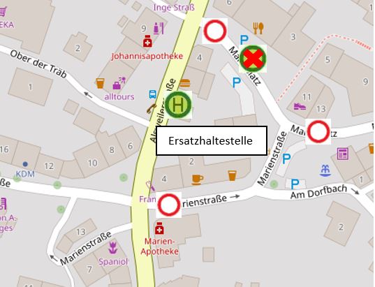Ersatzweise ist daher die Ersatzhaltestelle auf der Alsweilerstraße (vor Gürbüz-Kebab) zu nutzen.