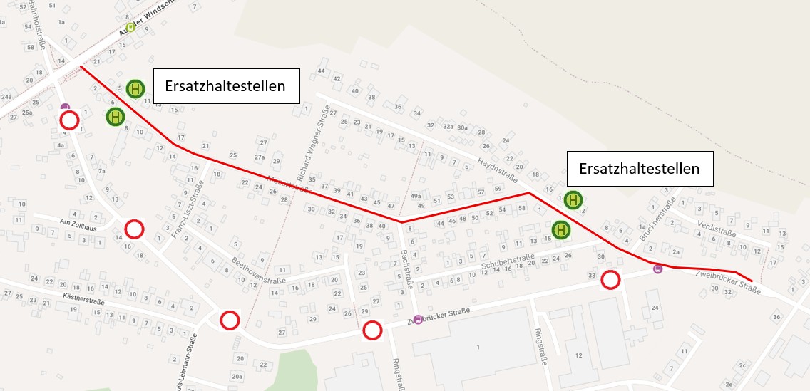 Aus Richtung Kirkel/Altstadt kommend die „Mozartstraße“ statt der „Zweibrücker Straße“ nutzen. Dieser folgen bis zur „Haydnstraße“ und dann weiter bis zur „Zweibrücker Straße“ folgen und ab hier weiter gem. regulärem Linienweg. Bitte die Ersatzhaltestellen entsprechend bedienen.