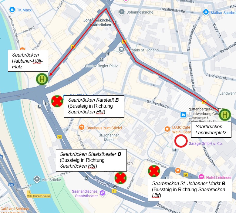 Die Haltepunkte Saarbrücken St. Johanner Markt, Saarbrücken Staatstheater und Saarbrücken Karstadt können in Richtung Saarbrücken Hbf leider nicht bedient werden.